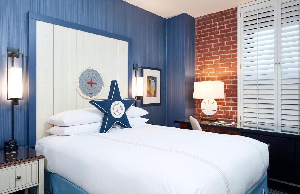 The nautically-themed rooms of the Argonaut are decorated with rich blue and white furniture. A flat-screen cable TV, minibar and coffee maker with coffee from San Francisco’s Vasquez Coffee Company are included.