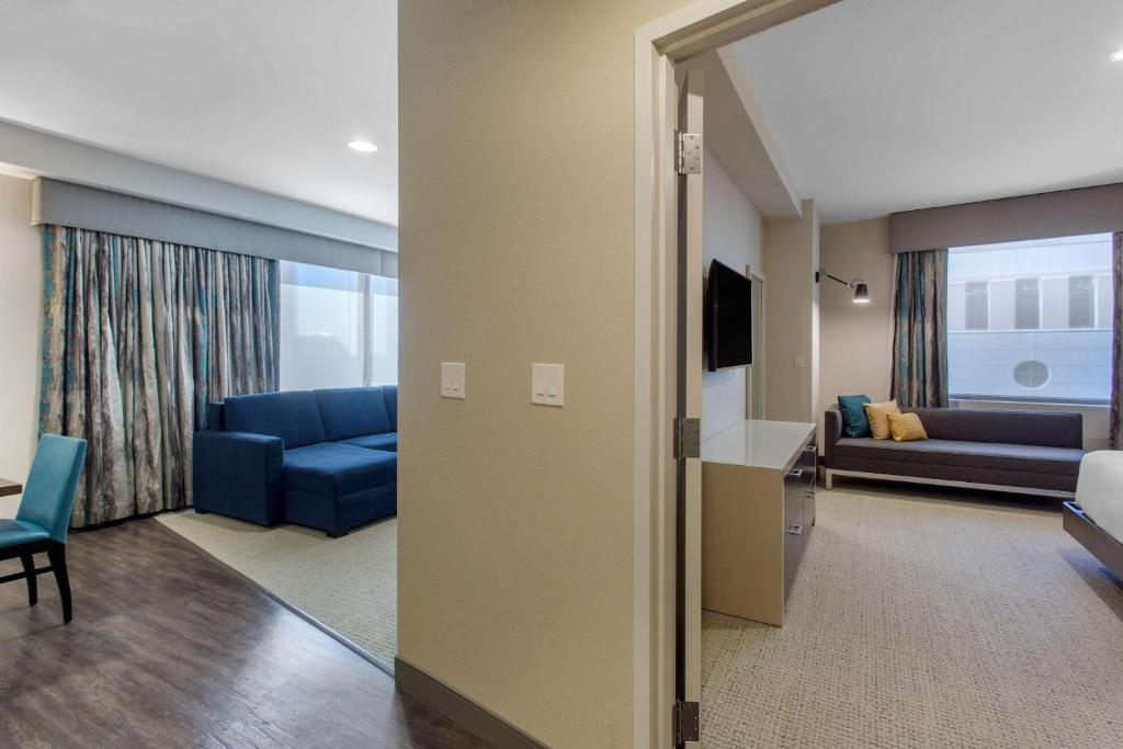 Each room features a microwave, refrigerator, Keurig coffee maker, flat-screen TV and a separate seating area.