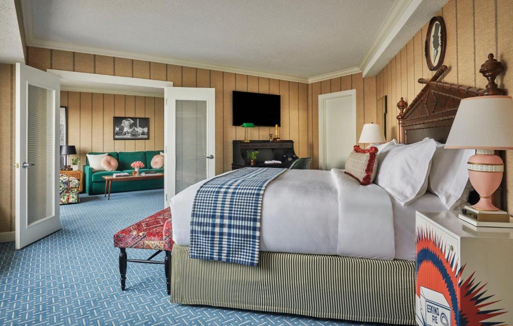 The elegant rooms at the hotel are styled with wood furniture and warm colors. Each includes a coffee maker, a work desk and lounge chair.