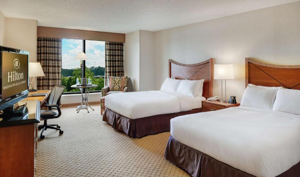 Each room at the Washington Dulles International Airport Hilton includes a flat-screen cable TV with pay-per-view channels. A hair dryer is in the en suite bathroom.