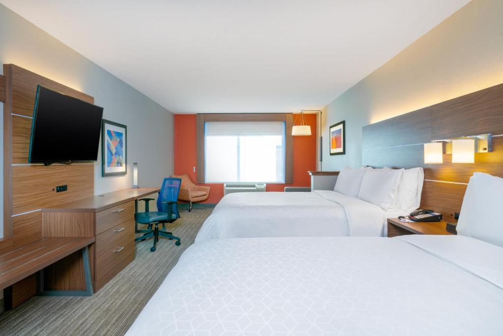 Every room at the Holiday Inn Express Hotel & Suites features a flat-screen cable TV and a seating area. Decorated in neutral tones and dark wood furnishings, these rooms also have a refrigerator and a microwave.