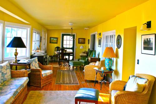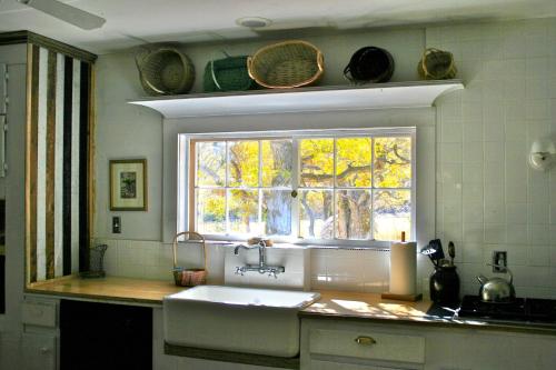The homey guest rooms at the Old Pioneer Garden include antique furniture and a private bathroom. Each building has a shared kitchen and dining area.