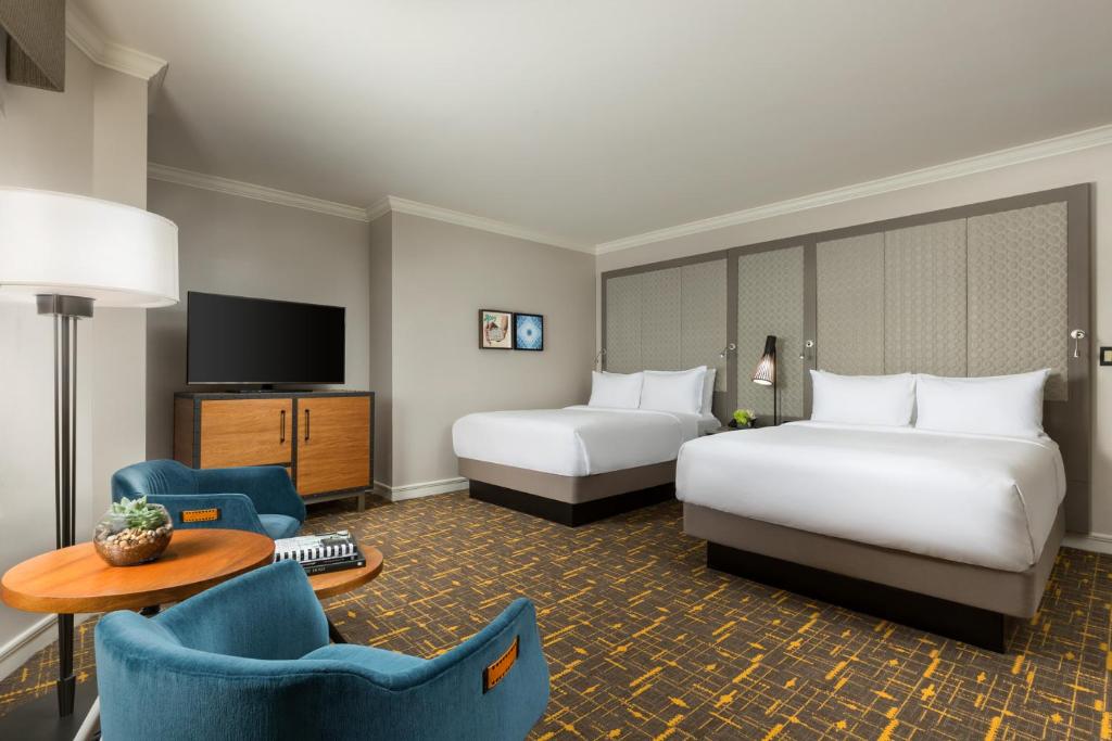 Select rooms feature a view of the San Francisco skyline at Stanford Court San Francisco. All guest rooms offer a pillow top mattress, speedy WiFi, a 49-inch high-definition television with HDMI and USB Ports, USB outlets, Staycast that enables guests stream content from their own devices, and a mini-refrigerator.
