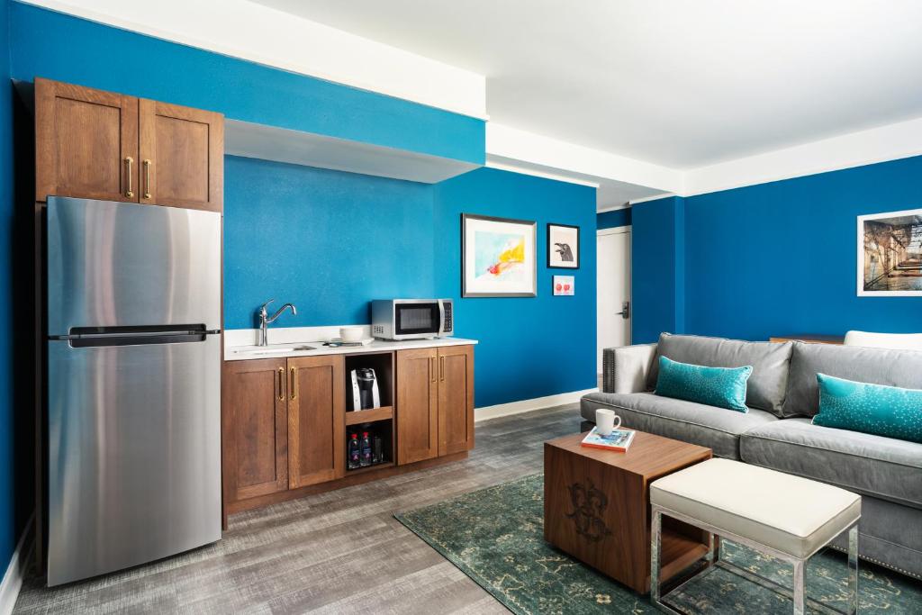 Suites include microwaves and refrigerators with freezers. They are also furnished with Keurig® coffeemakers, laptop size safes, Bluetooth radio alarm clocks and desks.